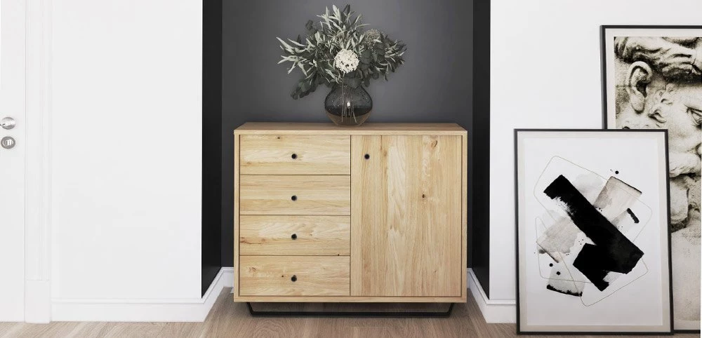 Eichenmöbel auf Metallbeinen eignen sich auch hervorragend für Wohnzimmer, wo sie meisterhaft mit Tischen und Couchtischen fusioniert werden können. Diese finden Sie ebenfalls in unserem umfangreichen Angebot. Durch diese Kombination bilden die Räume eine zusammenhängende Ganzheit. Ein modernes Schlafzimmer aus Eiche, eingerichtet mit Möbeln aus der Kollektion Steel, schafft eine Oase der Ruhe.
